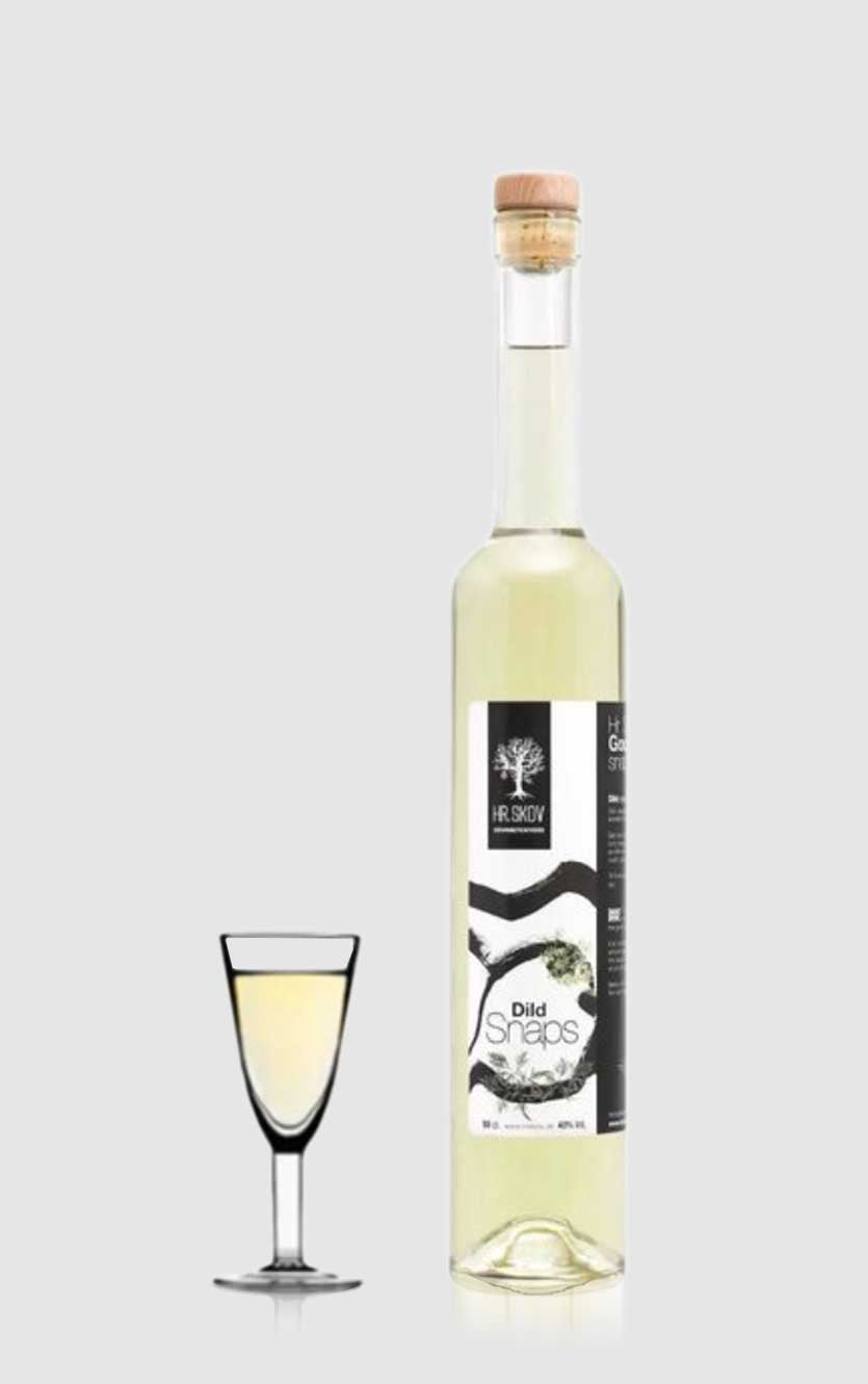 Hr. Skov's kryddersnaps med dild, har en fyldig men stadig rund smag af dild. Snapsen er trukket på krondild fra haverne i Blåvand. Med alderen vil snapsen efterlade gardiner rundt i glasset.