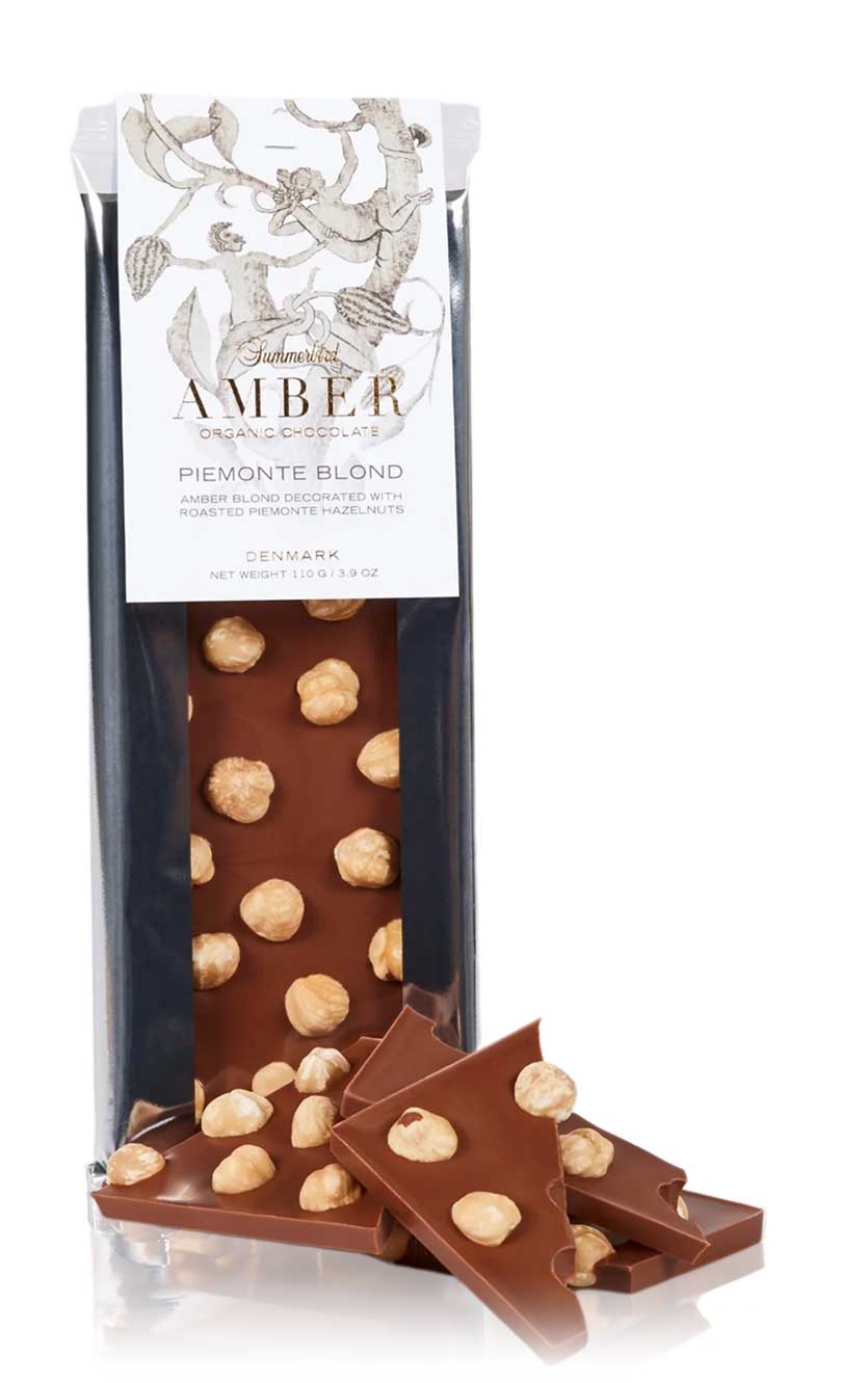 Forkæl dig selv med Amber Blond: En cremet chokoladebar med rige noter af karamel og frisk mælk. Toppet med de fineste økologiske hasselnødder fra Piemonte får du en uimodståelig balance mellem det søde, det milde og det sprøde
